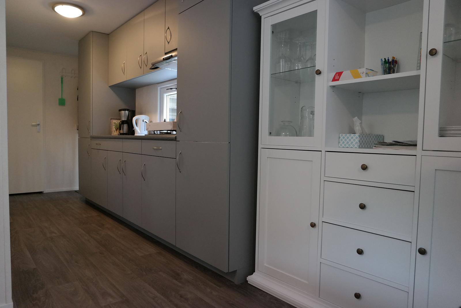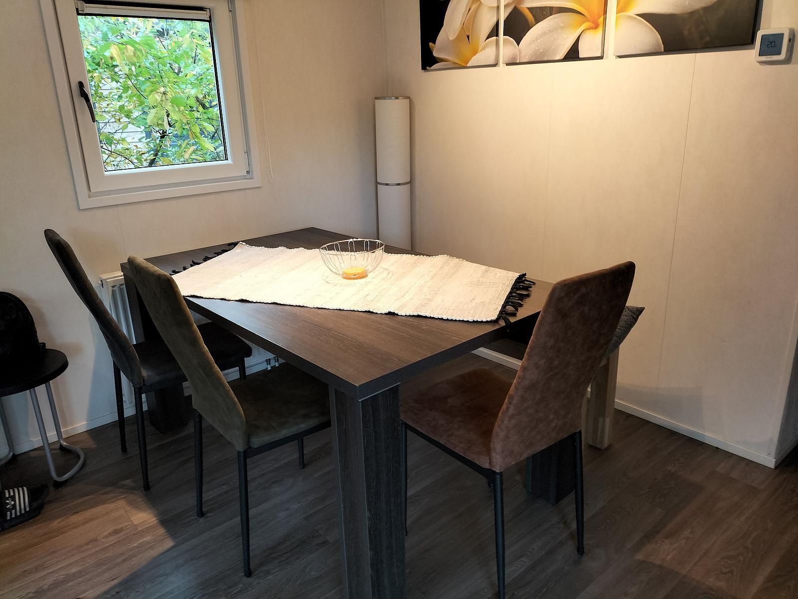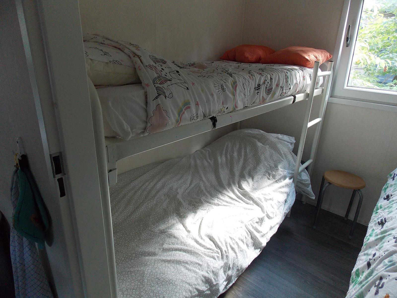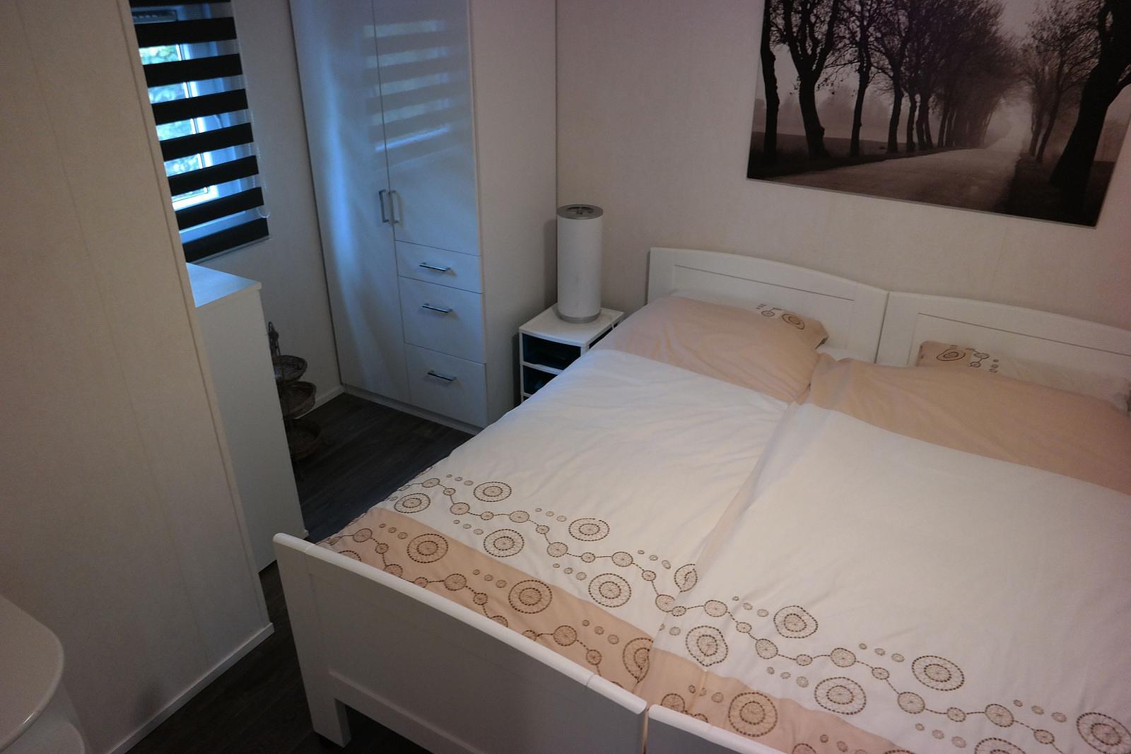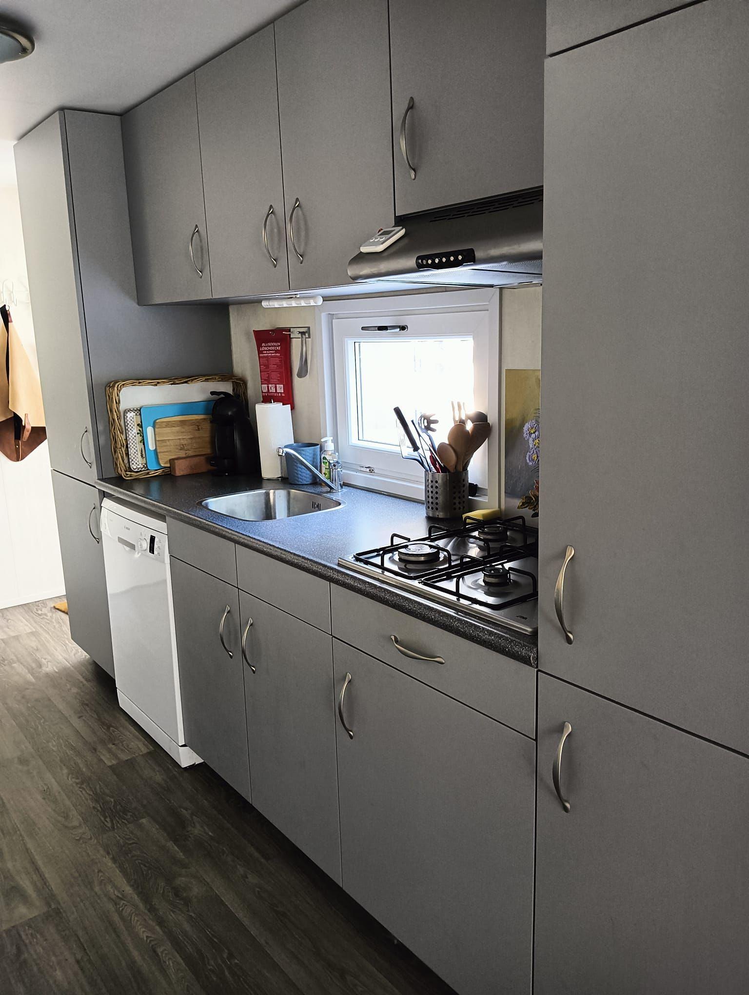 De keuken is modern en praktisch ingericht met een Bosch vaatwasser, inbouwkoelkast, 4-pits gaskookplaat en afzuigkap. Het chalet beschikt over twee slaapkamers. De ruime slaapkamer van 12 m² is voorzien van een comfortabel tweepersoons boxspringbed (180 x 200), een grote hang-legkast, een ladekast en horren voor de ramen. Daarnaast staat hier een TV. De tweede slaapkamer biedt plaats aan een stapelbed en een eenpersoonsbed.