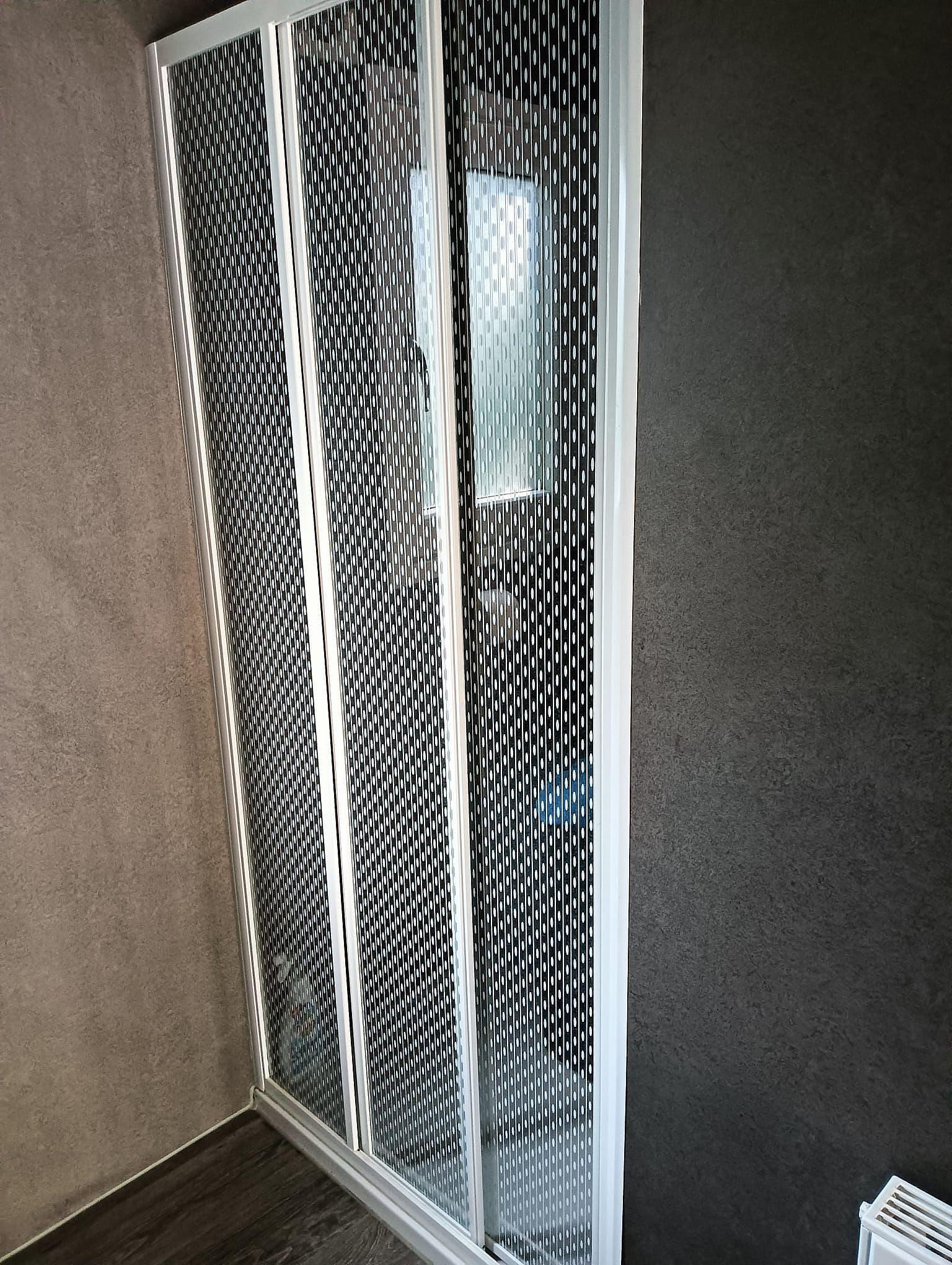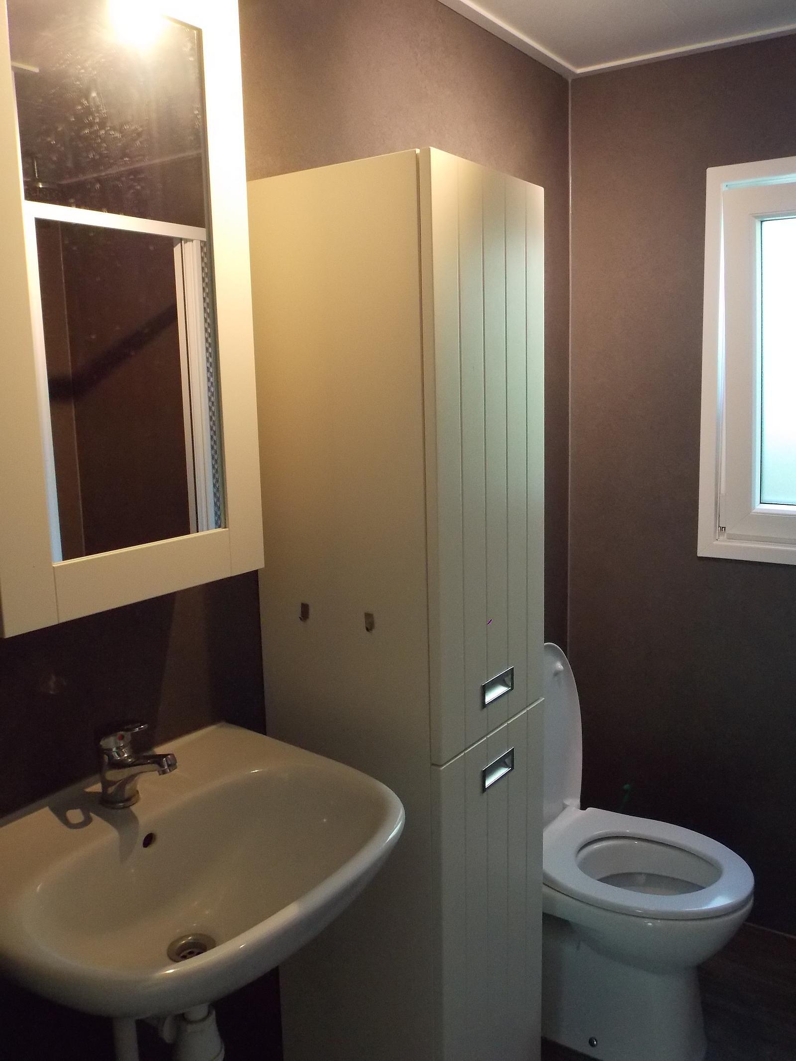 De badkamer is praktisch en modern uitgevoerd met een wastafel, spiegelkast, hoge opbergkast, toilet en een inloopdouche met thermostaatkraan en regendouche. De chalet is voorzien van een centrale verwarming.